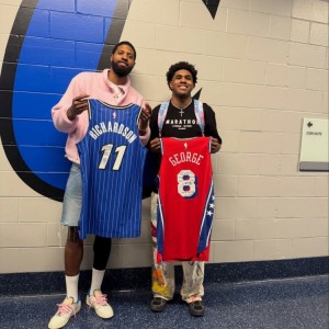 1月11日讯 昨日,76人客场103-91击败魔术,赛后乔治和魔术新秀杰斯·理查德森交换球衣并合影。赛后,乔治的AAU球...